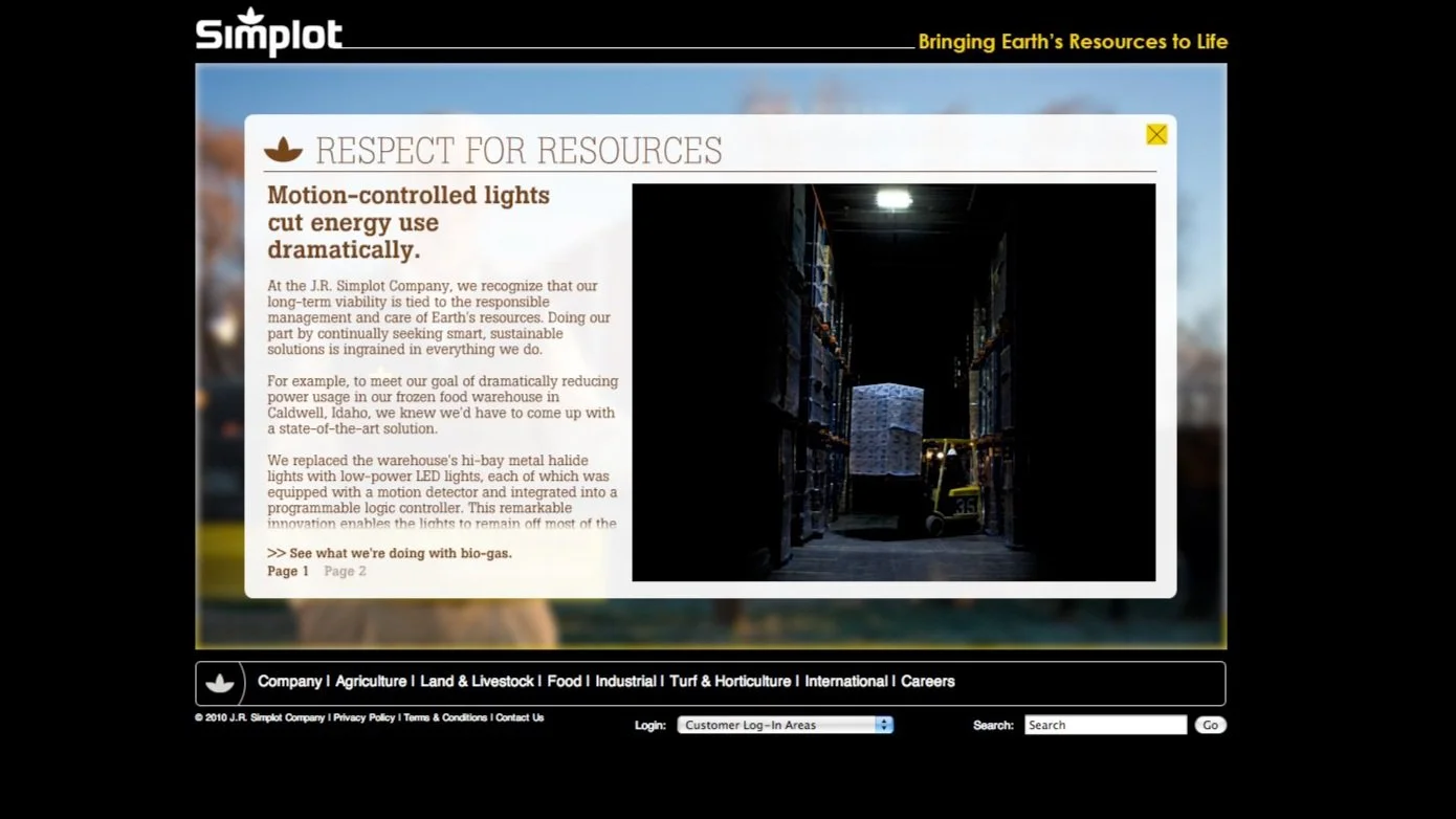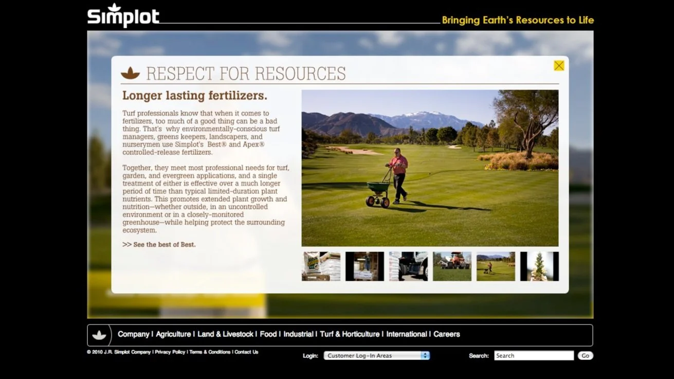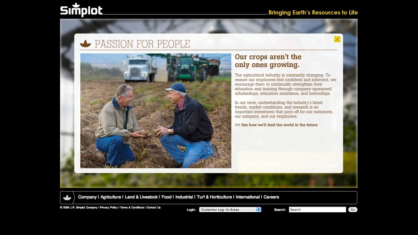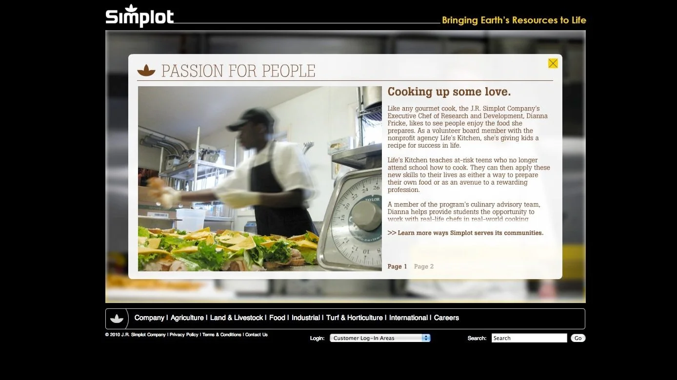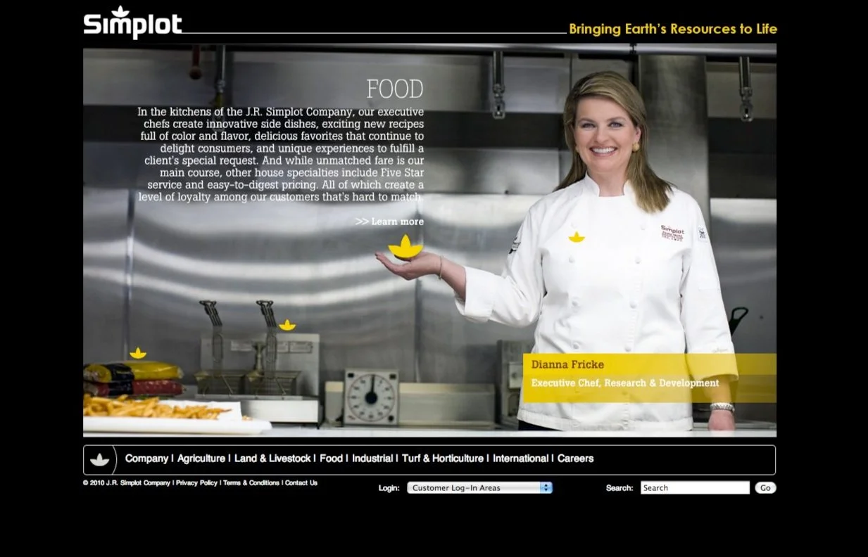 Had the opportunity to give the Simplot.com site a nice jump start into the 2000’s. Backed by a very talented team of account leads, developers, designers, and a fantastic freelance photographer we brought life to the people behind the company that helped and continues to put Idaho on the map. This was a fun one to produce and creative direct.